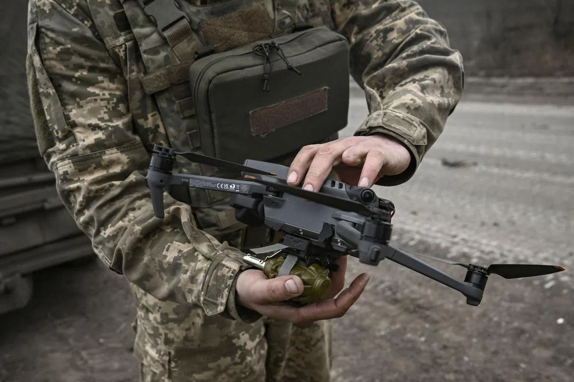 A Ukrainian serviceman attaches a hand grenade to a drone for use in an attack, near Bakhmut.