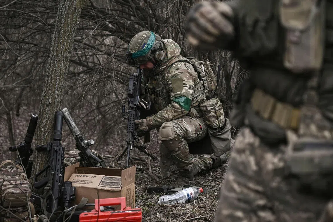 Members of the Ukrainian commando unit wait in the woods near Bakhmut, in Ukraine's Donbas region, on March 15, 2023.