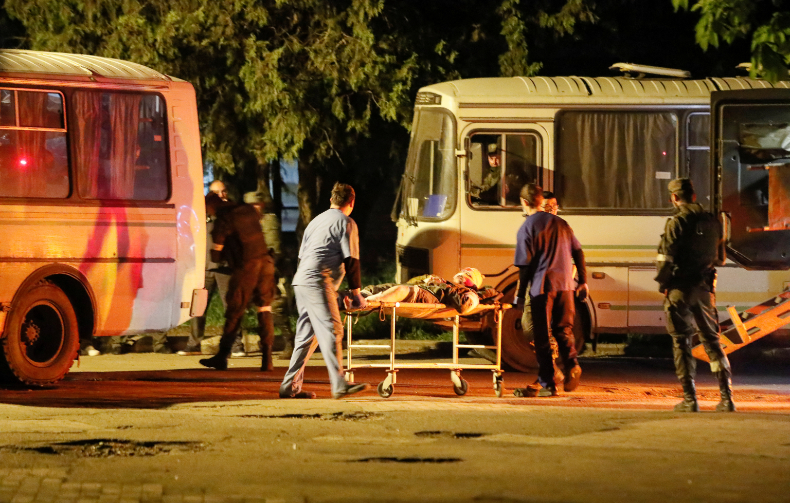 Some of the evacuated troops were wounded and carried out of the buses on stretchers.