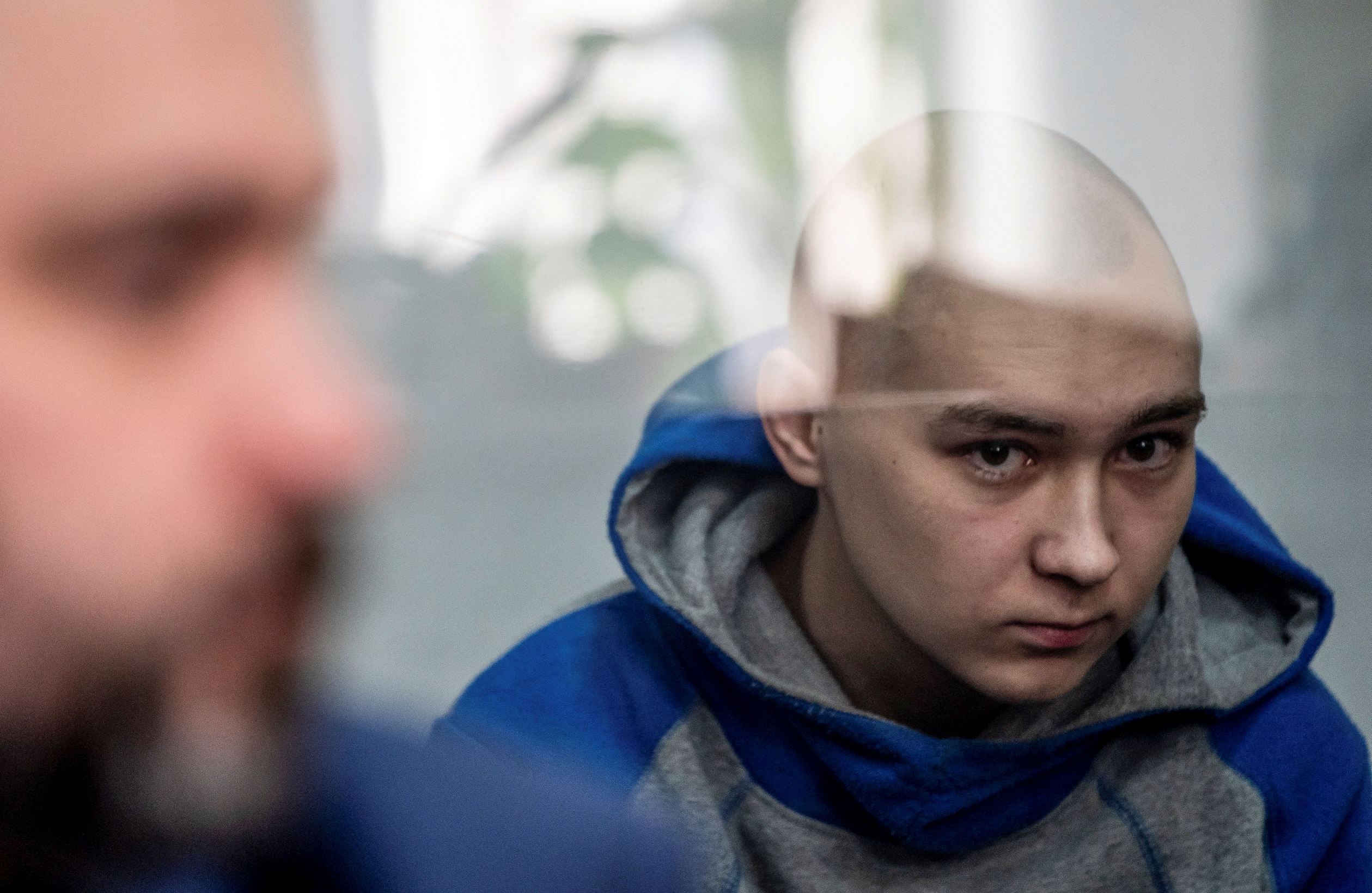 Russian soldier Vadim Shishimarin, 21, sits inside a defendants' cage during a court hearing in Kyiv.