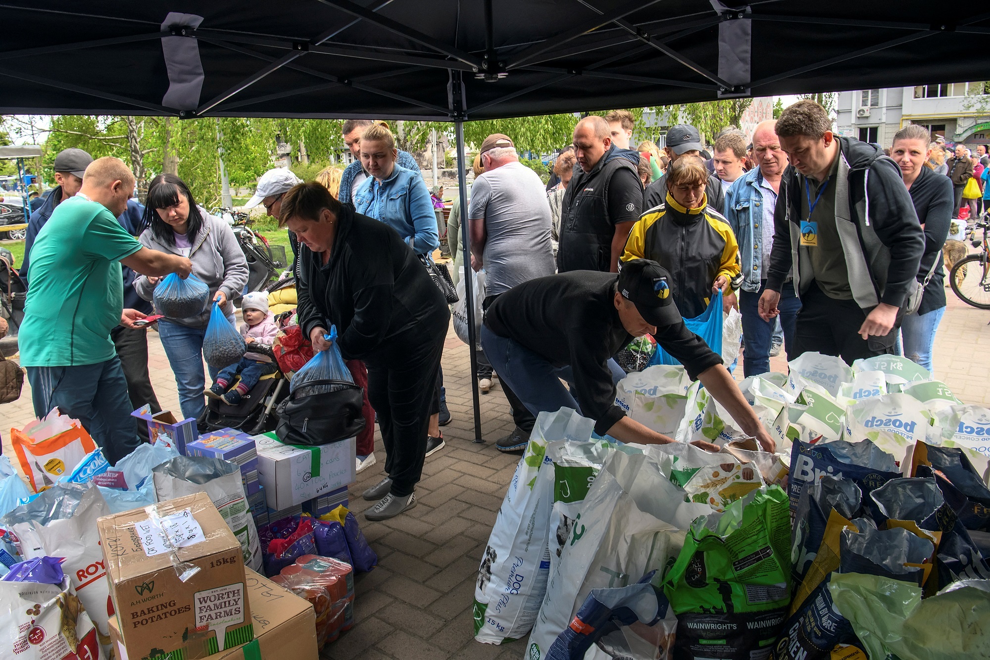 Local residents receive humanitarian aid, in the town of Borodianka, in the Kyiv region.