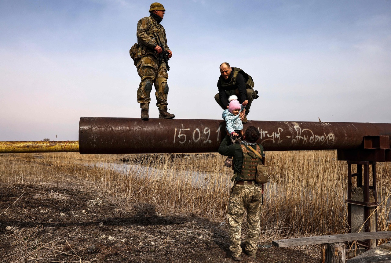 Ukrainian servicemen help a baby cross a pipeline over a river, on the outskirts of Kyiv, on March 31, 2022.