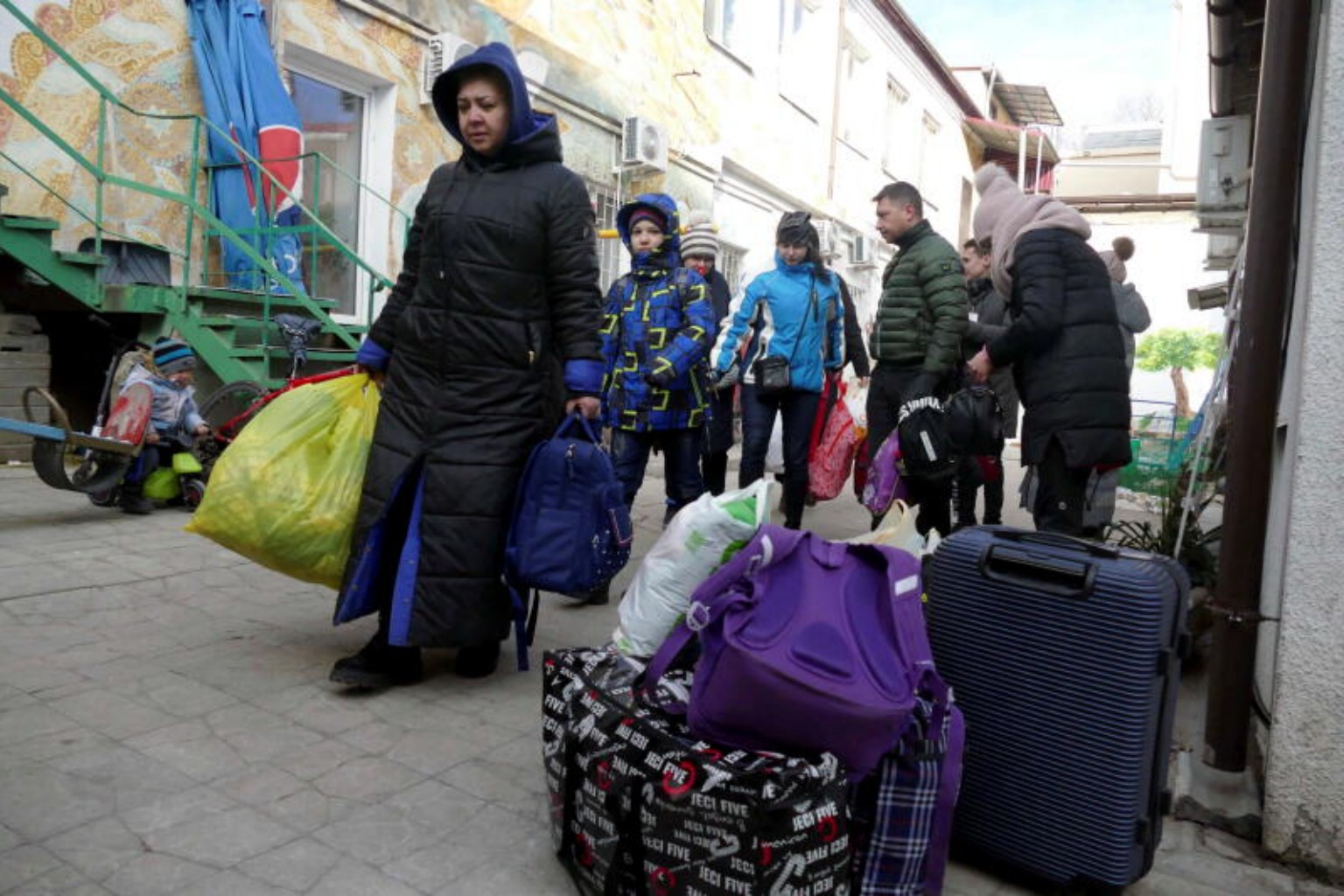 People carry their belongings as they flee in Odessa, Ukraine, on March 10, 2022.