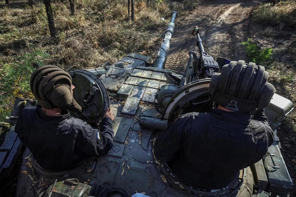 Ukrainian servicemen ride aboard a tank in Ukraine’s Donetsk region.