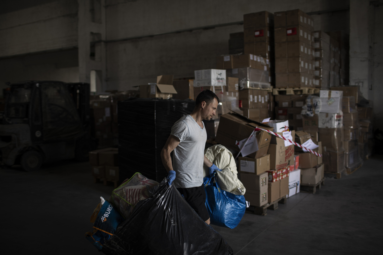 Roman, a volunteer, sorts items at the Volunteering and Defense Center on the outskirts of Lviv, Ukraine, on May 20, 2022.