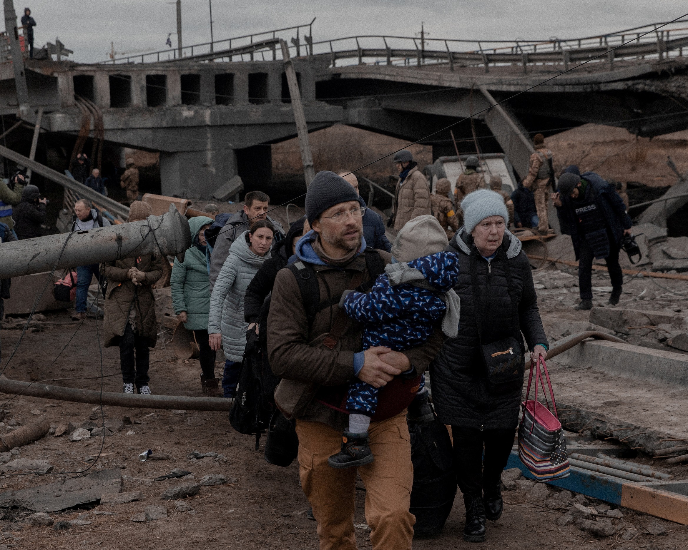 Soldiers were ushering the fleeing residents onto buses on the Kyiv side of the Irpin River because walking on that part of the city's streets was no longer safe.