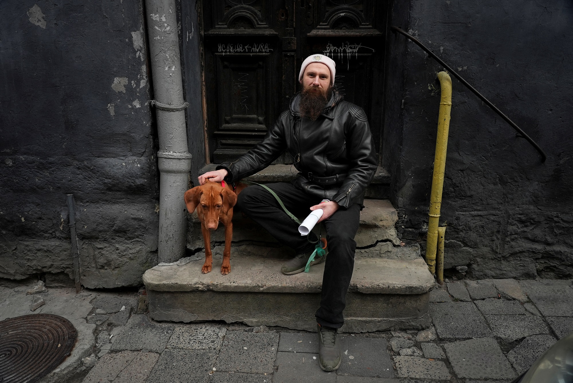 Video producer Yuri Futalo poses for a picture with his dog as he collects documents necessary to purchase a gun, in Lviv, Ukraine.