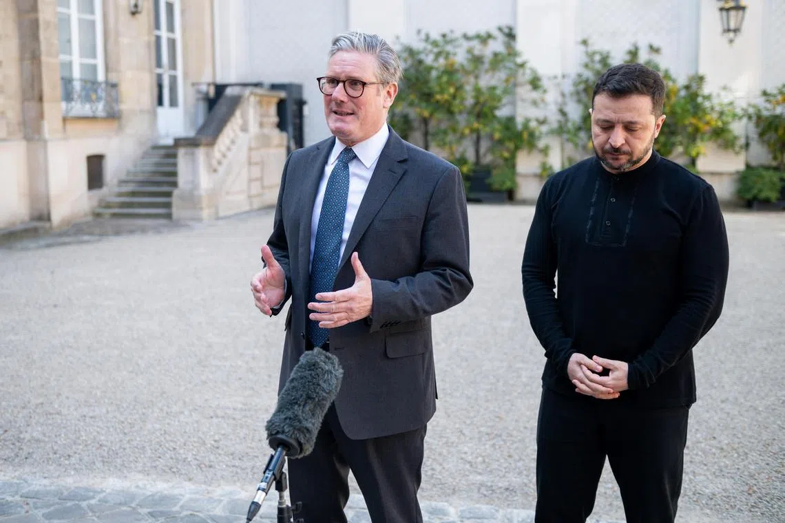 British Prime Minister Keir Starmer (left) and Ukrainian President Volodymyr Zelensky speaking to the press following the Ukraine summit in Paris, on March 27.