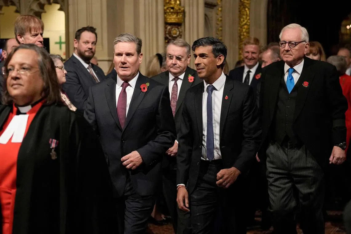Britain’s PM Rishi Sunak (centre) and Britain’s main opposition Labour Party leader Keir Starmer (left) during the State Opening of Parliament on Nov 7.