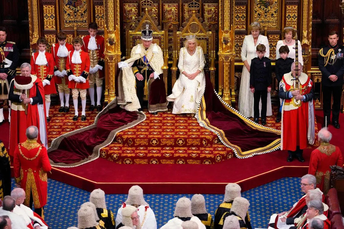 Britain’s King Charles III, wearing the Imperial State Crown and the Robe of State, and Britain’s Queen Camilla, wearing the George IV State Diadem, sit on The Sovereign’s Throne in the House of Lords chamber.