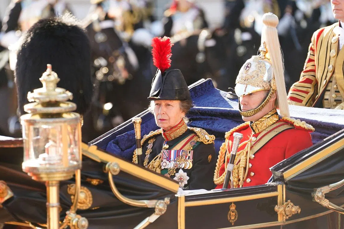 Princess Anne, Charles’s sister, rode in the procession, performing the ceremonial role of the King’s “protector”, formally known as Gold Stick in Waiting.