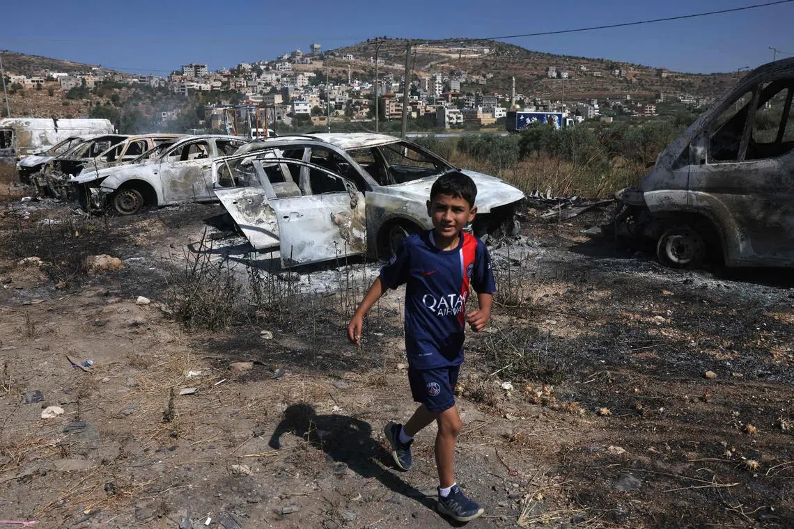 A child walks past burnt cars, reportedly set ablaze by Israeli settlers, in the occupied West Bank.