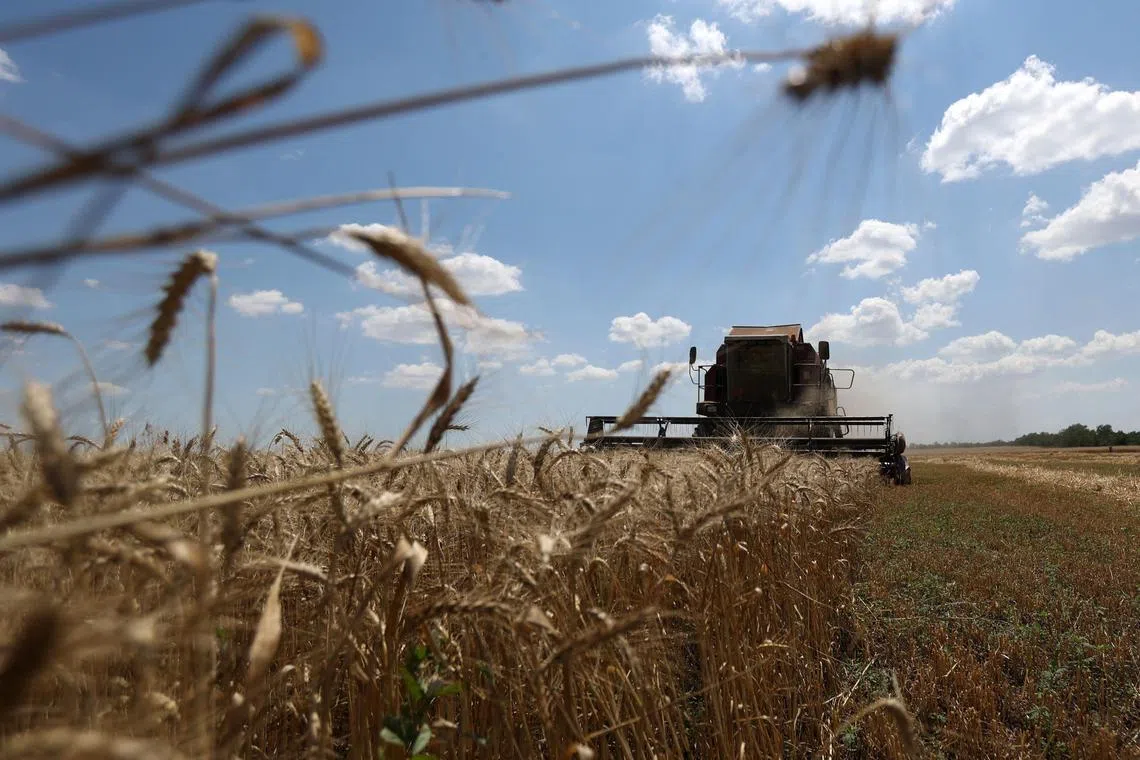 A combine harvests wheat in Ukraine's Mykolaiv region.