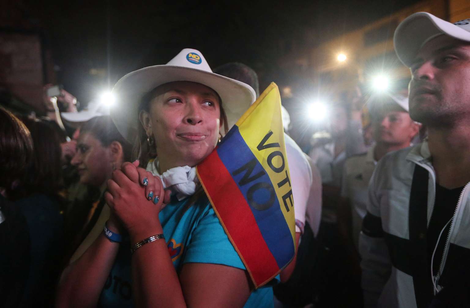 'No' supporters at a rally after their victory in the referendum to end the 52-year-old guerrilla war between the FARC and the state on Oct 2, 2016 in Bogota, Colombia.