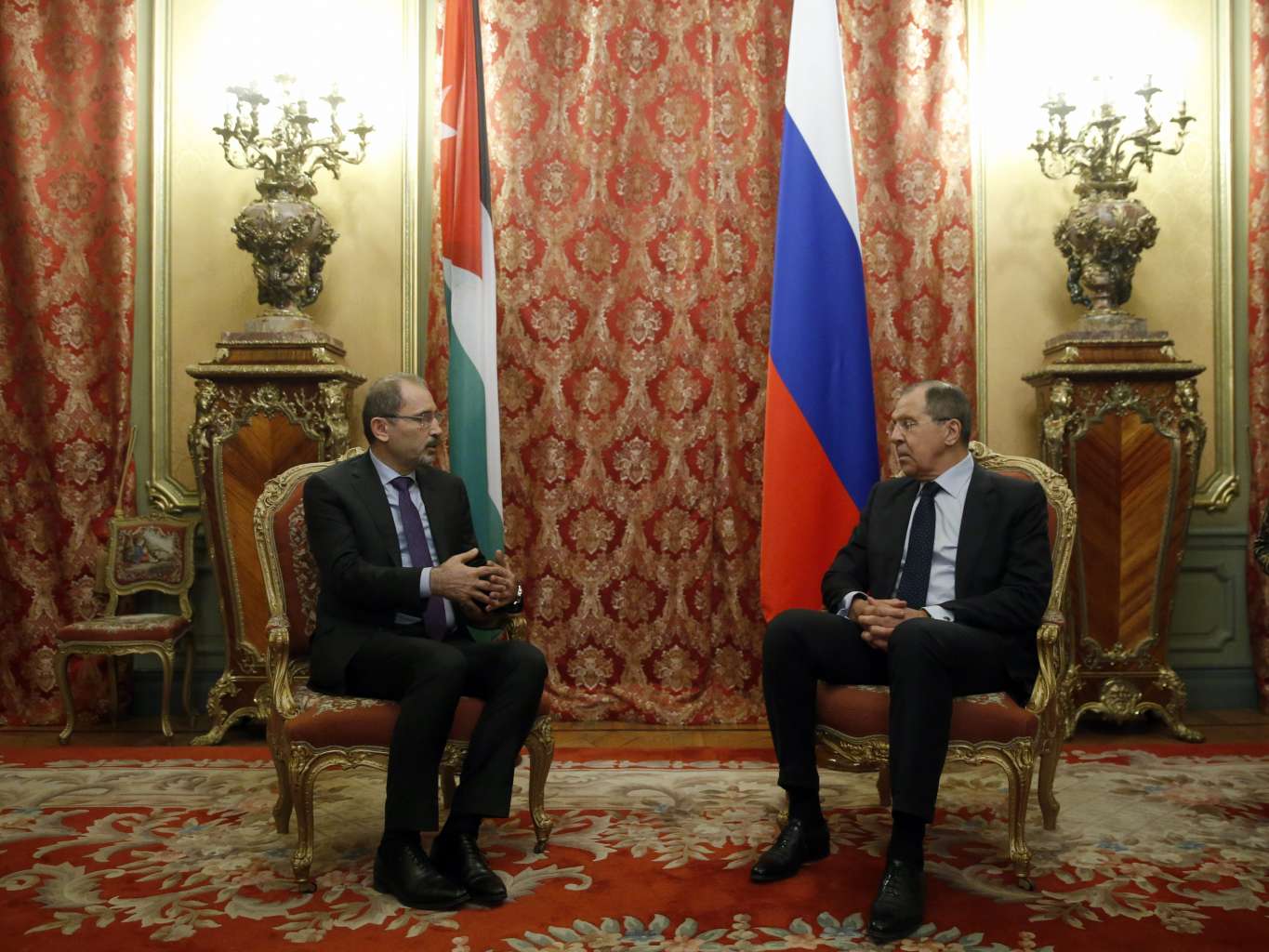 Russian Foreign Minister Sergei Lavrov (left) speaking with Jordanian Minister of Foreign Affairs Ayman Al Safadi.