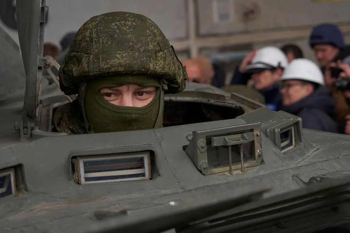 A Russian serviceman keeps watch from the hatch of a military vehicle as Mr Grossi’s delegation visits Ukraine’s Zaporizhzhia nuclear power plant.