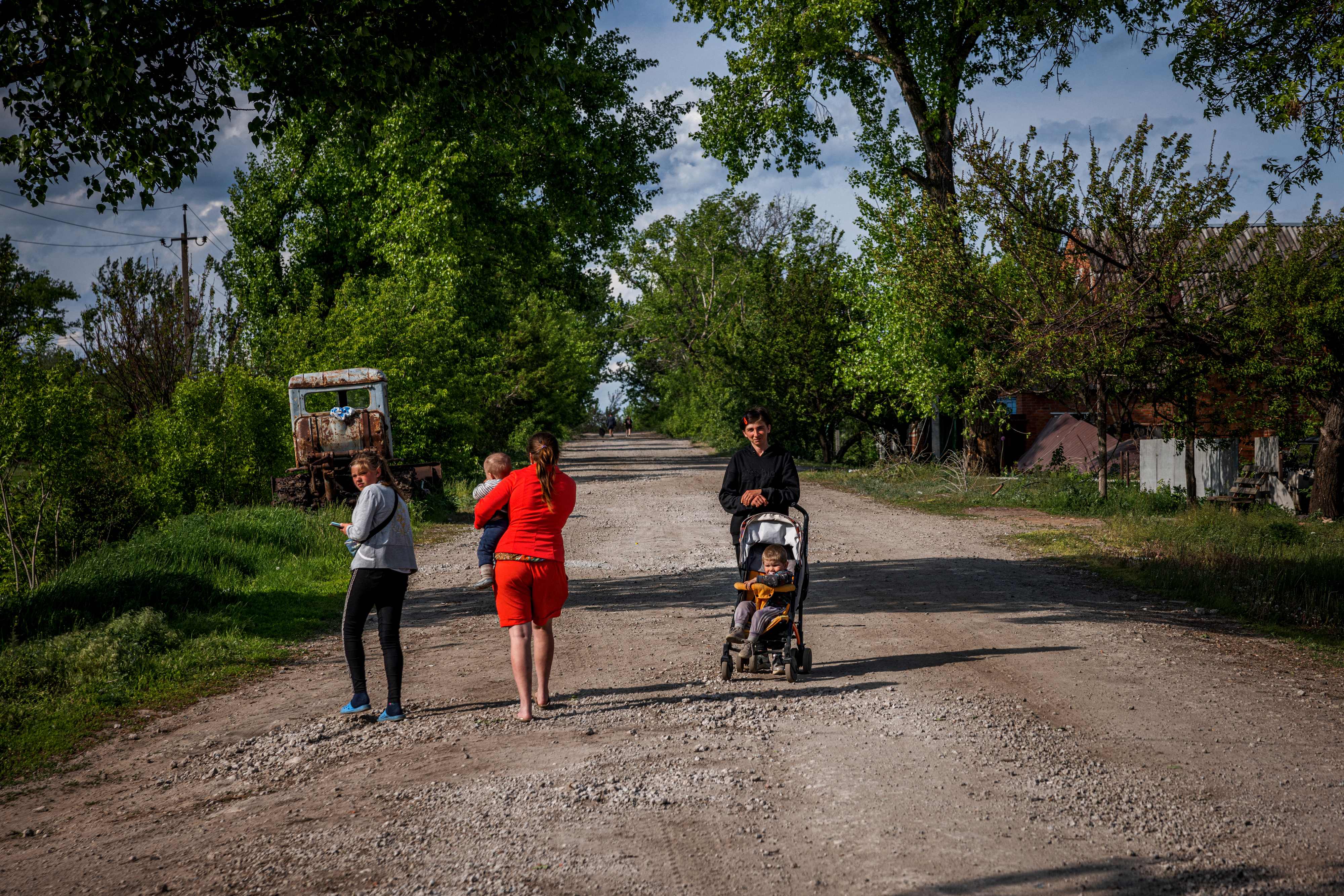 Women walk with their children in a village near Kharkiv, in eastern Ukraine.