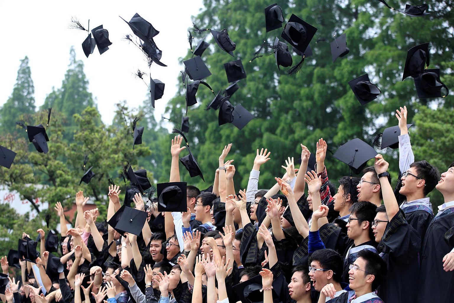 Graduates throw their mortar boards as they pose for pictures at an university in China on May 31.