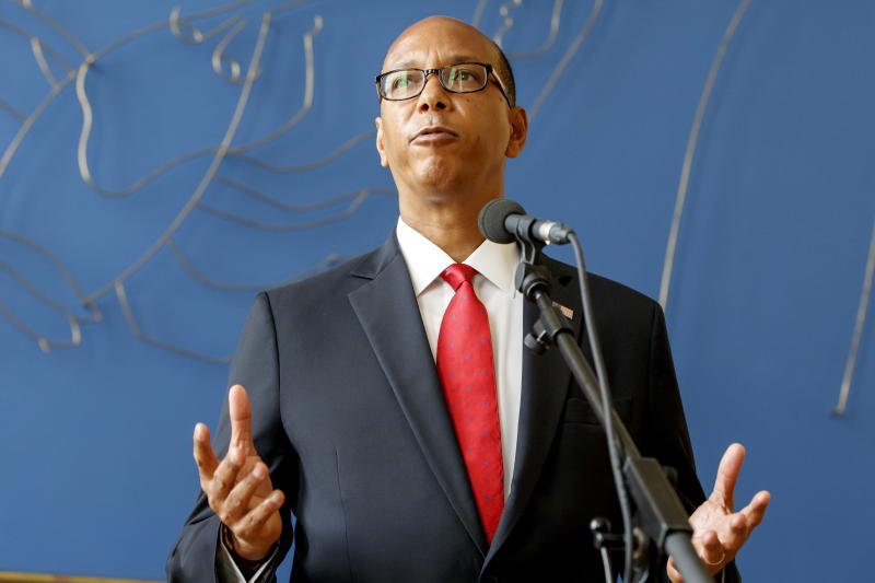 US Disarmament Ambassador Robert Wood speaks to the media during a media briefing, prior the Conference on Disarmament under Syrian presidency.