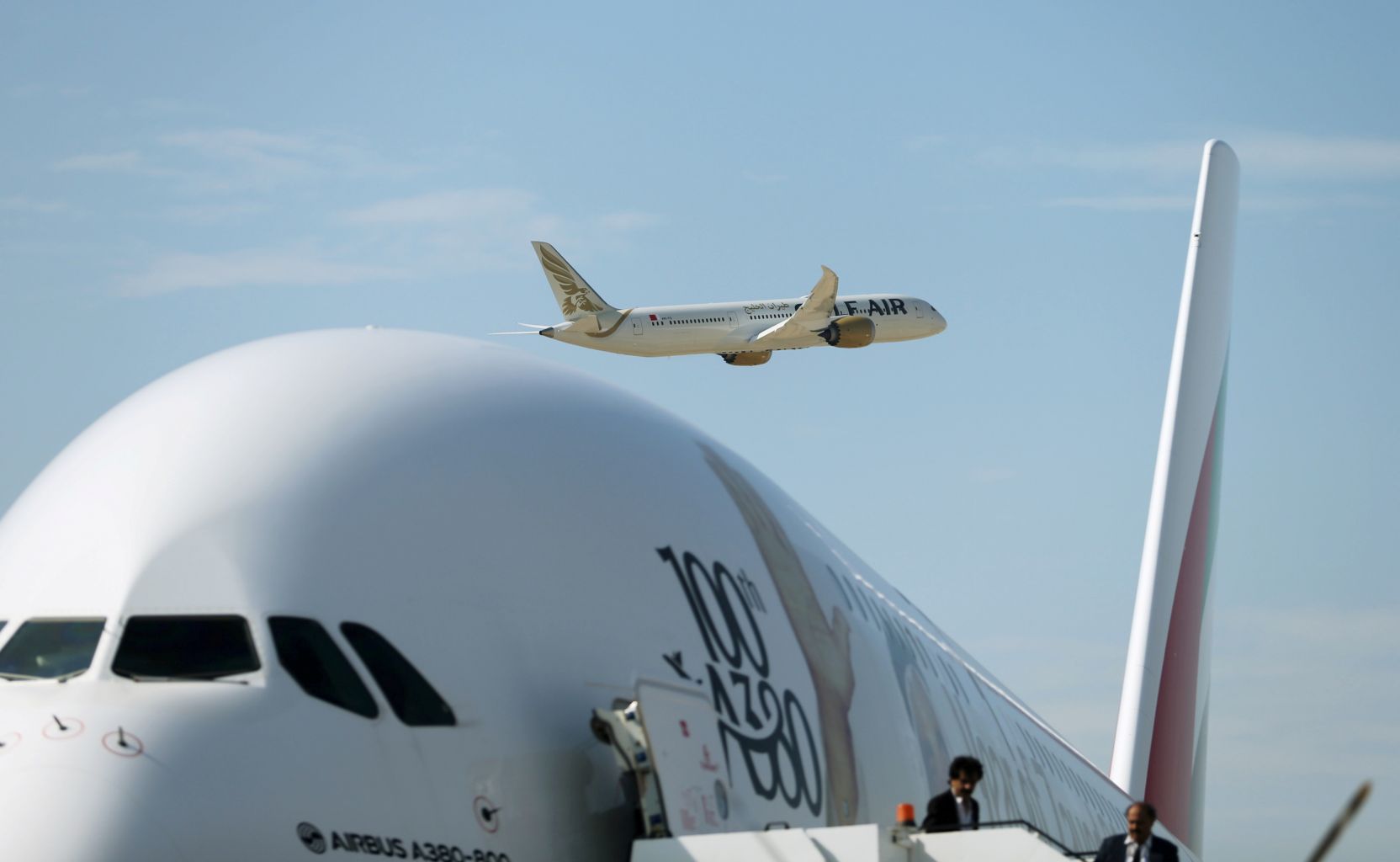 A 2018 photo shows a Boeing 787-9 Dreamliner making a fly-by as an Airbus A380-800 plane sits on the tarmac at the Bahrain International Air Show.,