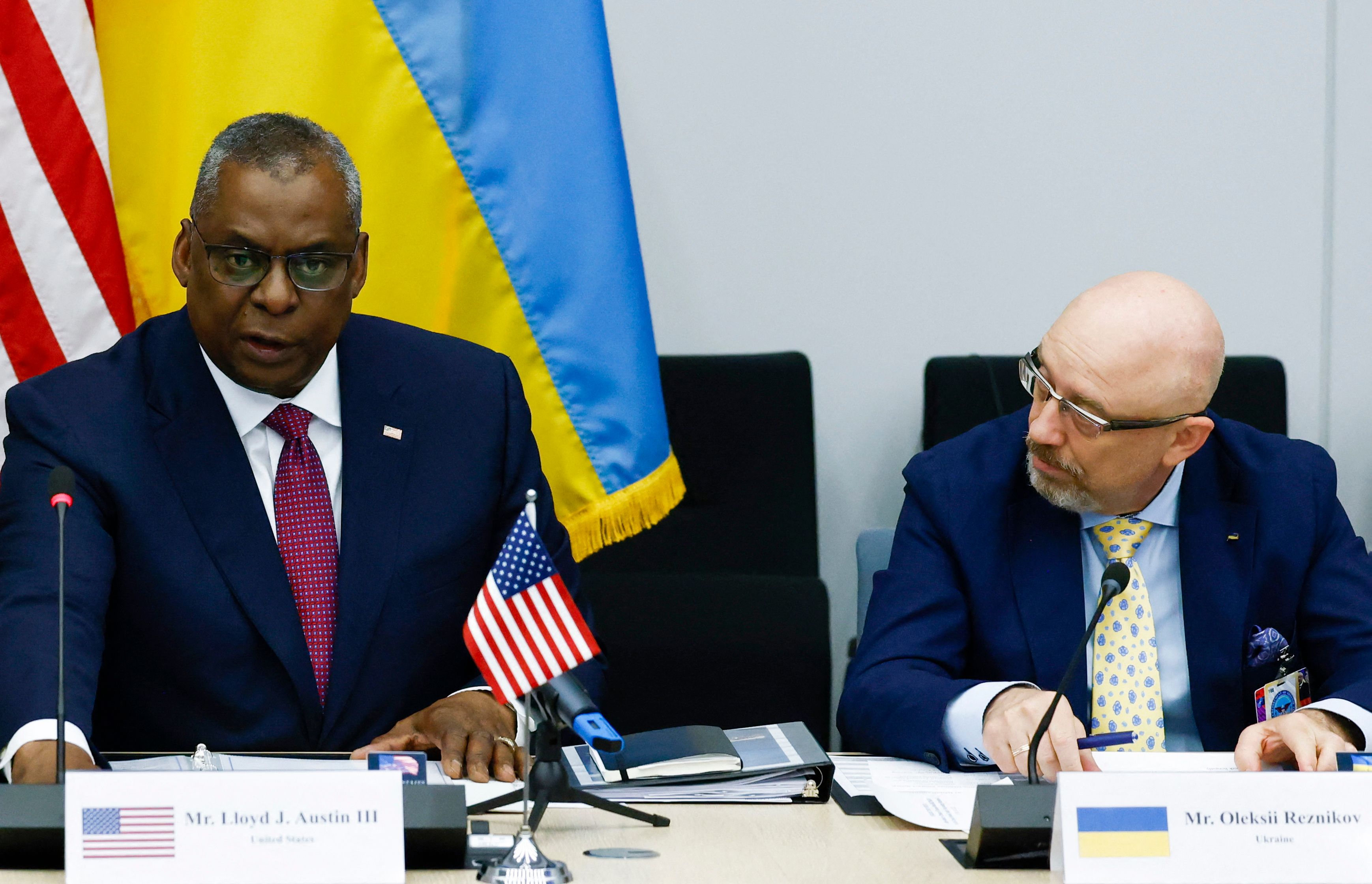 US Defence Secretary Lloyd Austin and Ukraine's Defence Minister Oleksii Reznikov at a Ukraine Defence Contact Group meeting on June 15, 2022.