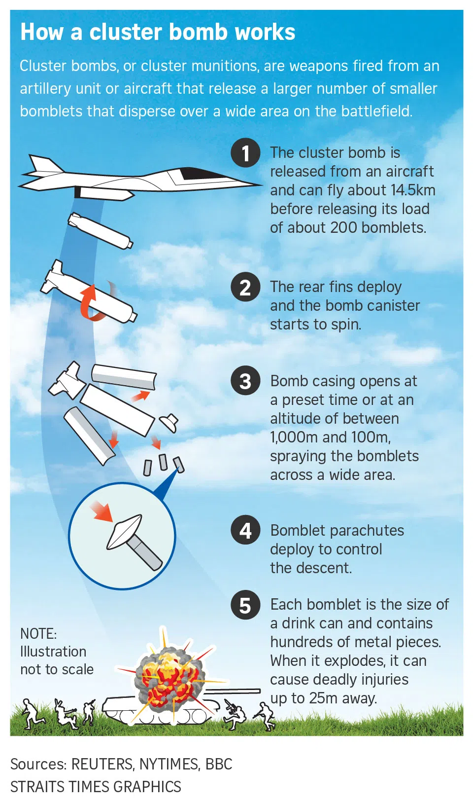 The cluster munitions, banned by more than 120 countries, normally release large numbers of smaller bomblets that can kill indiscriminately over a wide area, threatening civilians.