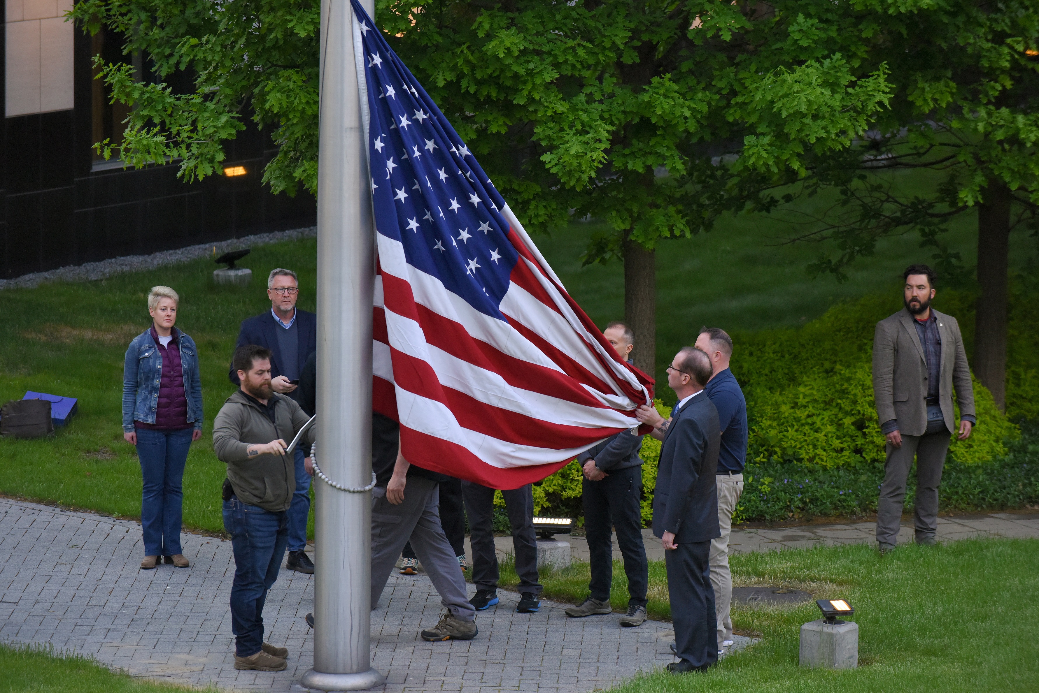 Members of the US diplomatic mission in Ukraine raise the US national flag at the US embassy in Kyiv, on May 18, 2022.