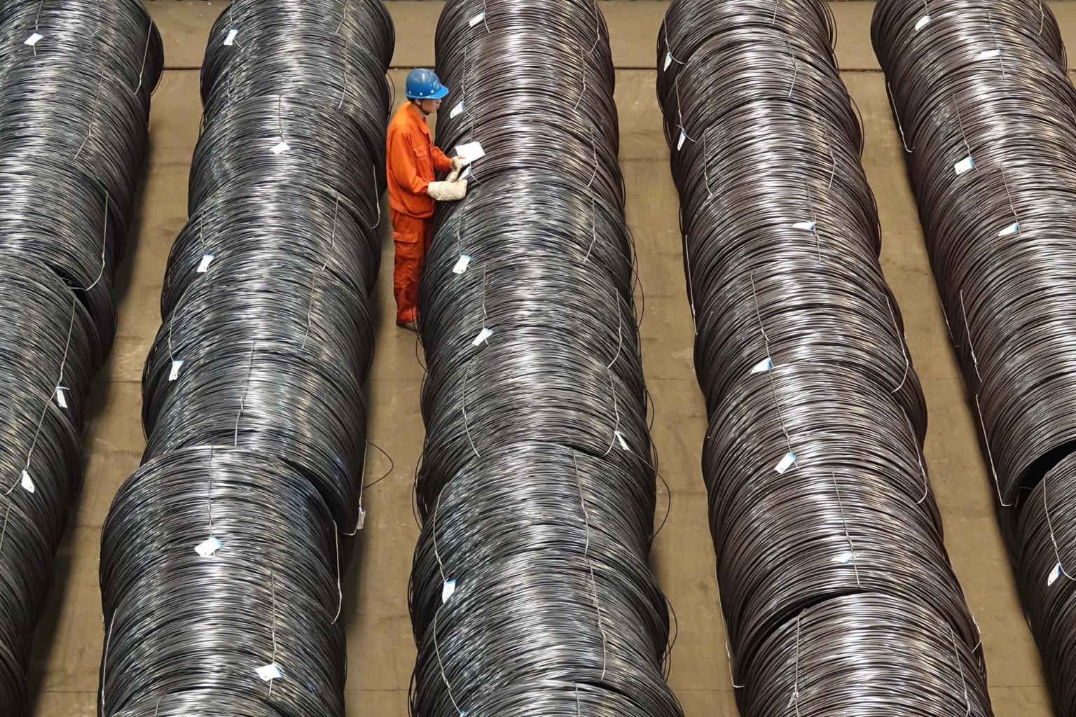 A worker checking steel wires at a warehouse in Dalian, Liaoning province, China on May 15, 2017.