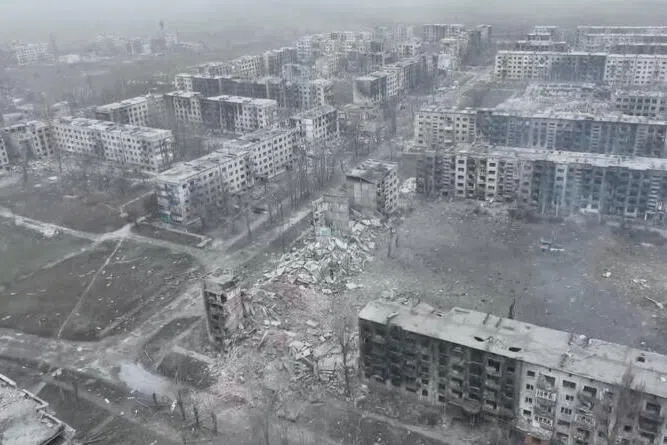 A drone view showing damaged buildings in Myrnohrad, Donetsk Region, Ukraine, in a still image obtained from a video released on Dec 15.