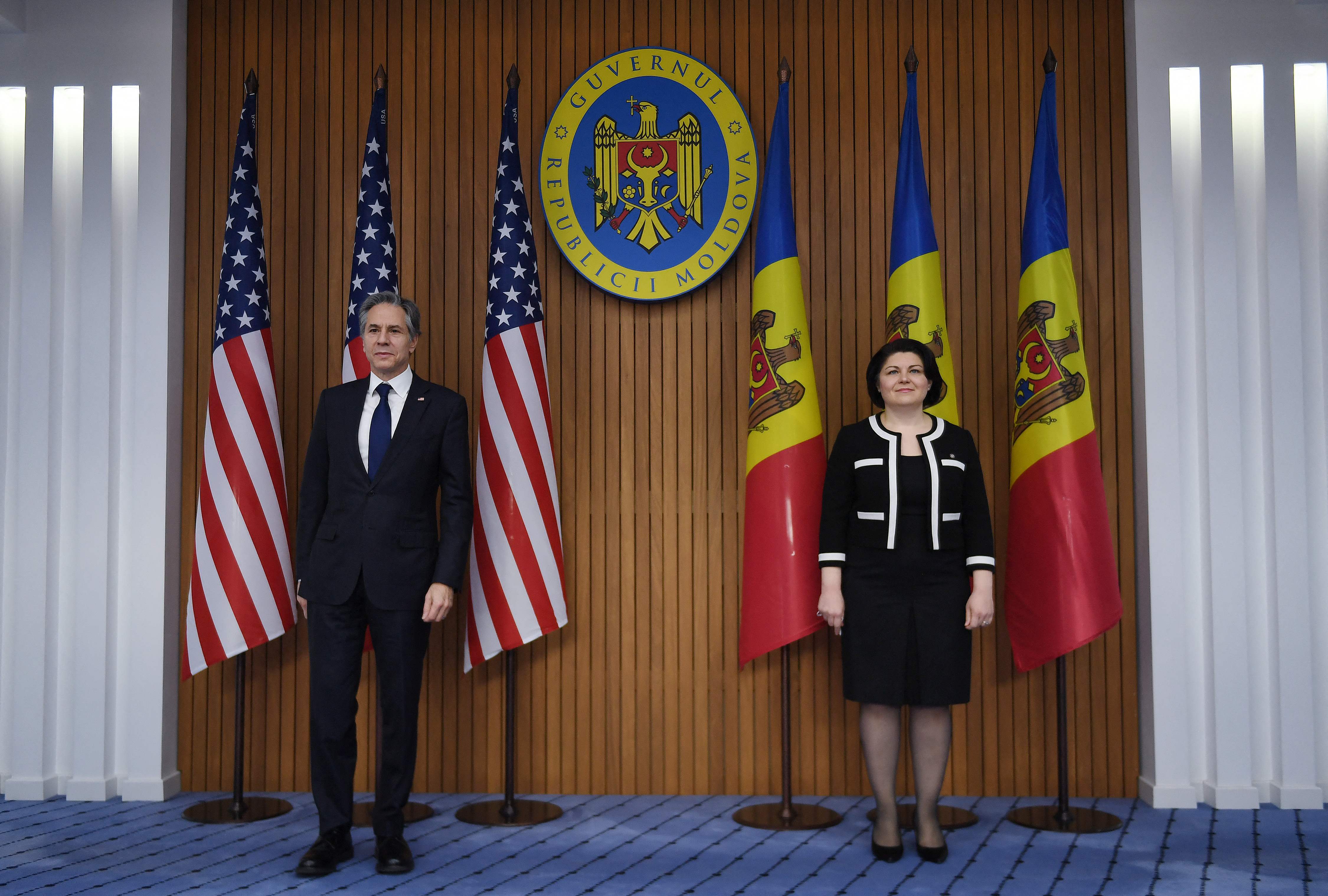 US Secretary of State Antony Blinken (left) meets Moldovan Prime Minister Natalia Gavrilita at the Government House in Chisinau, Moldova on March 6, 2022.