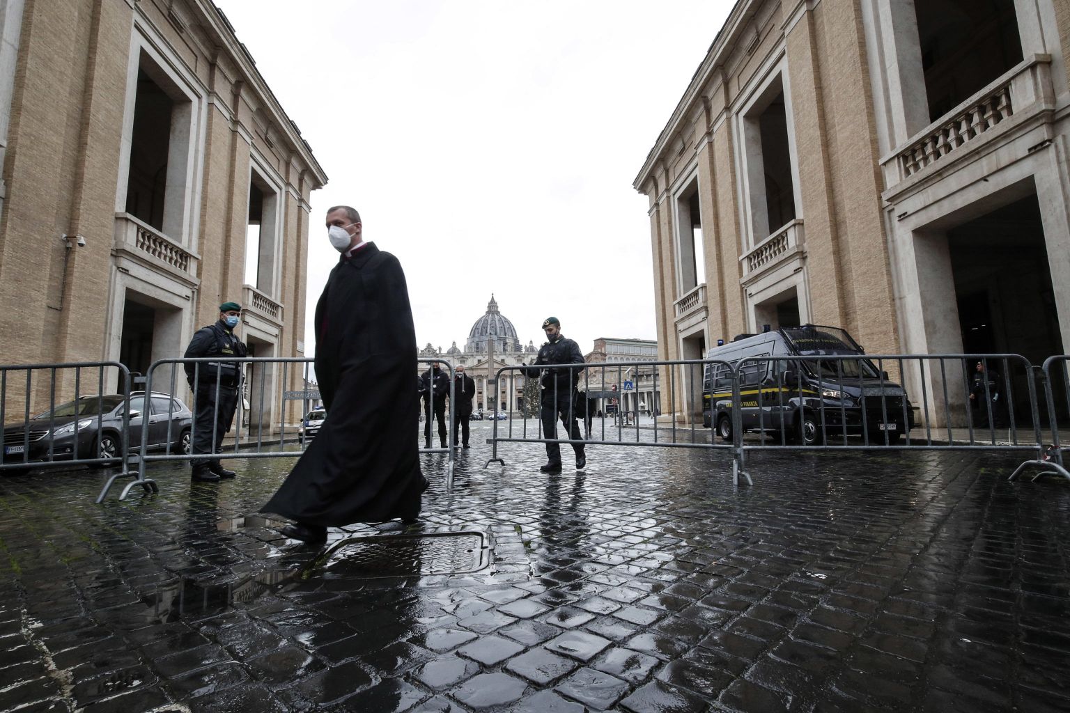 A priest crosses an empty St Peter's Square in the Vatican City, amid a lockdown aimed at curbing the spread of Covid-19.