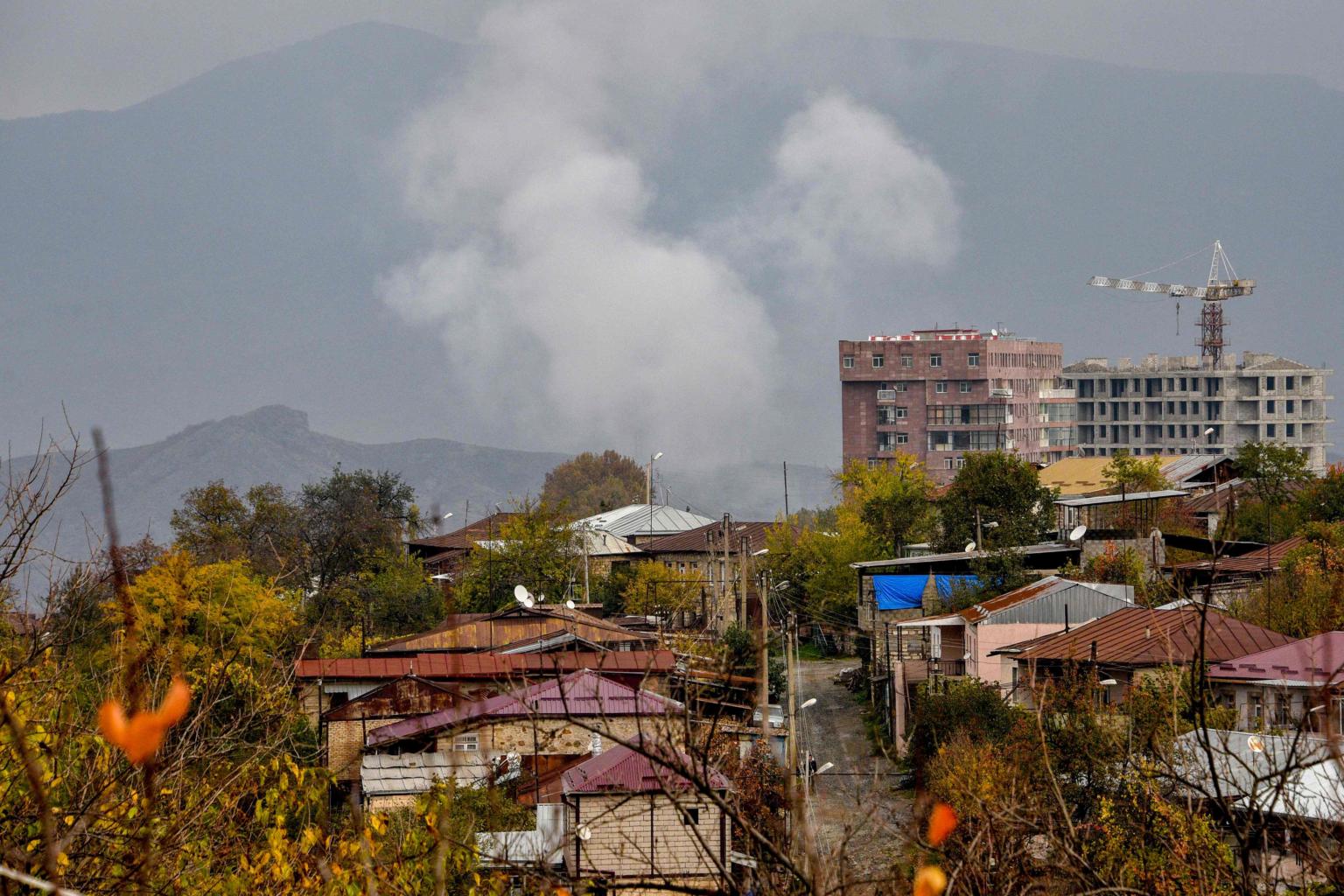 The smoke from an explosion rises above the houses after a shelling in the disputed province's capital of Stepanakert on Nov 6, 2020.