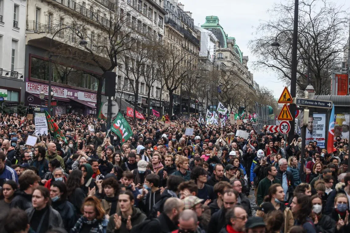 Thousands of people participating in a protest against government pension reforms in Paris, on March 23, 2023.