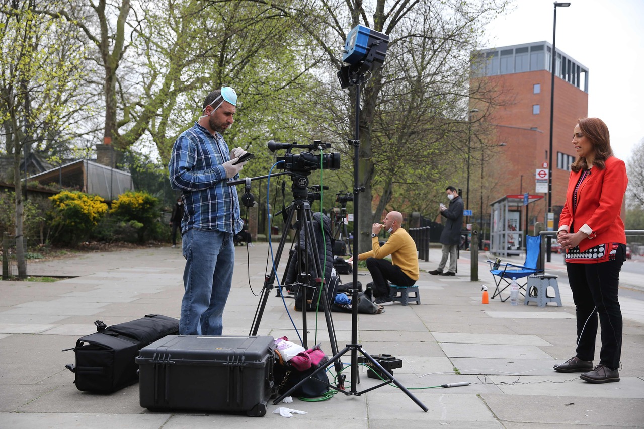 Journalists gather outside St Thomas' Hospital in central London on April 8, 2020.