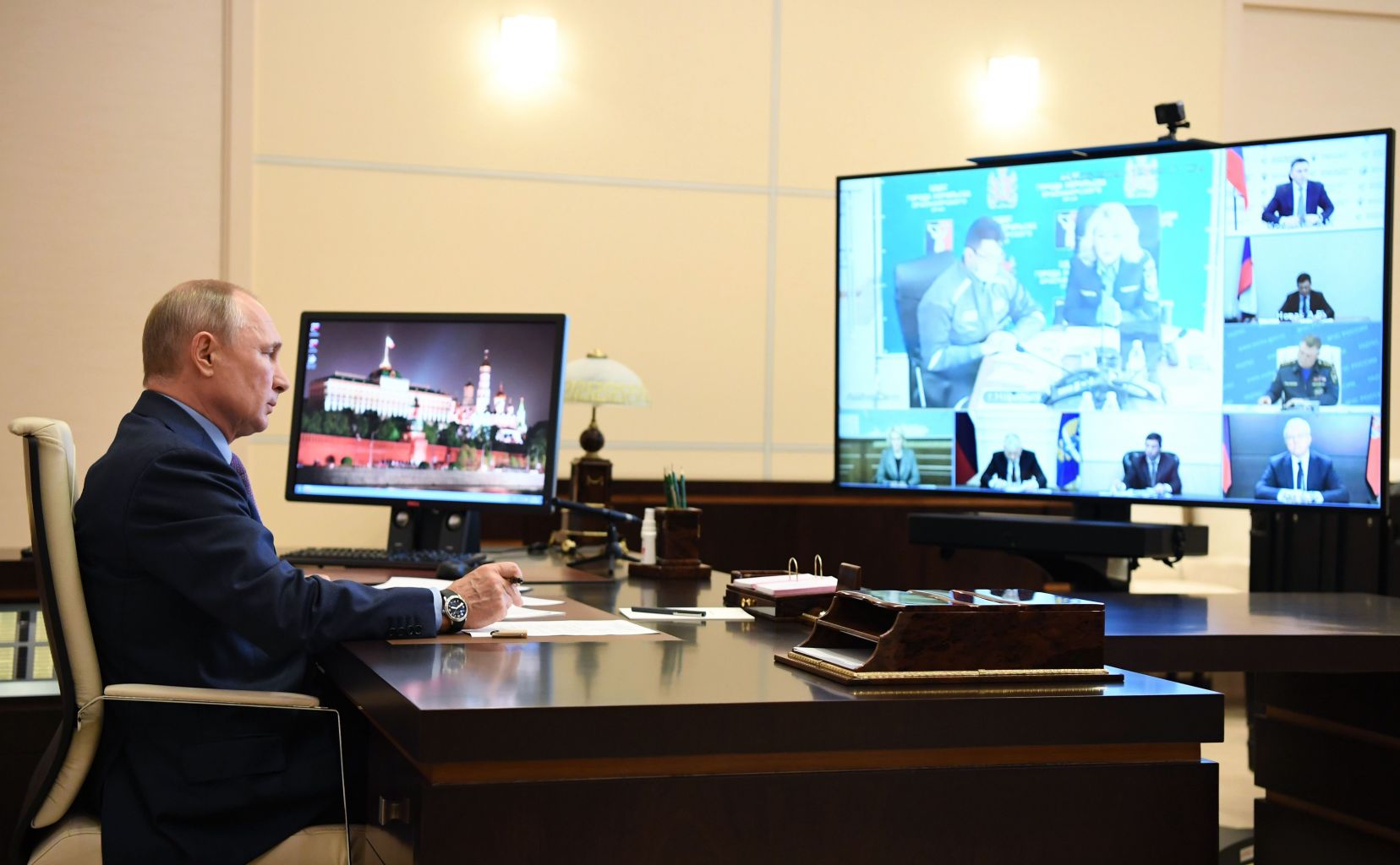 Putin chairs a meeting on dealing with consequences of the fuel spill, June 3, 2020.