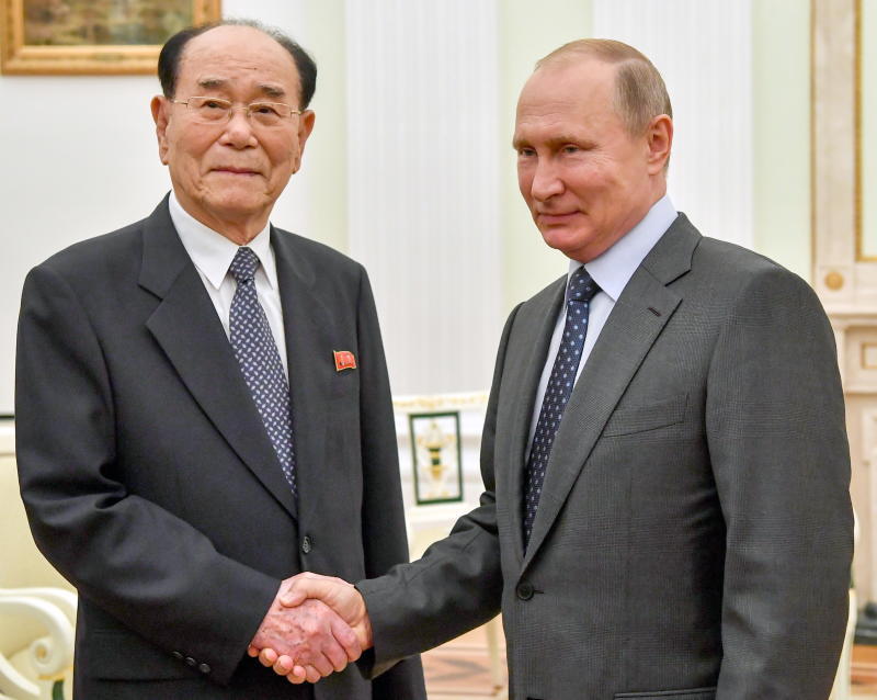 Russian President Vladimir Putin (right) with President of the North Korean Presidium of the Supreme People's Assembly Kim Yong Nam during their meeting at the Kremlin in Moscow, Russia, on June 14, 2018.