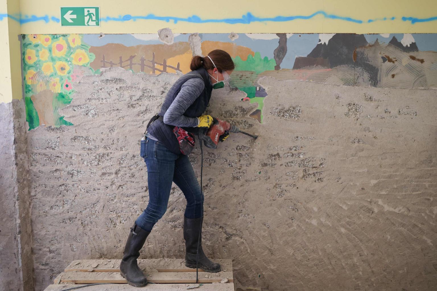Inside the school, volunteers are working to strip flood-damaged walls, chipping away at a mural painted by the schoolchildren depicting the globe.