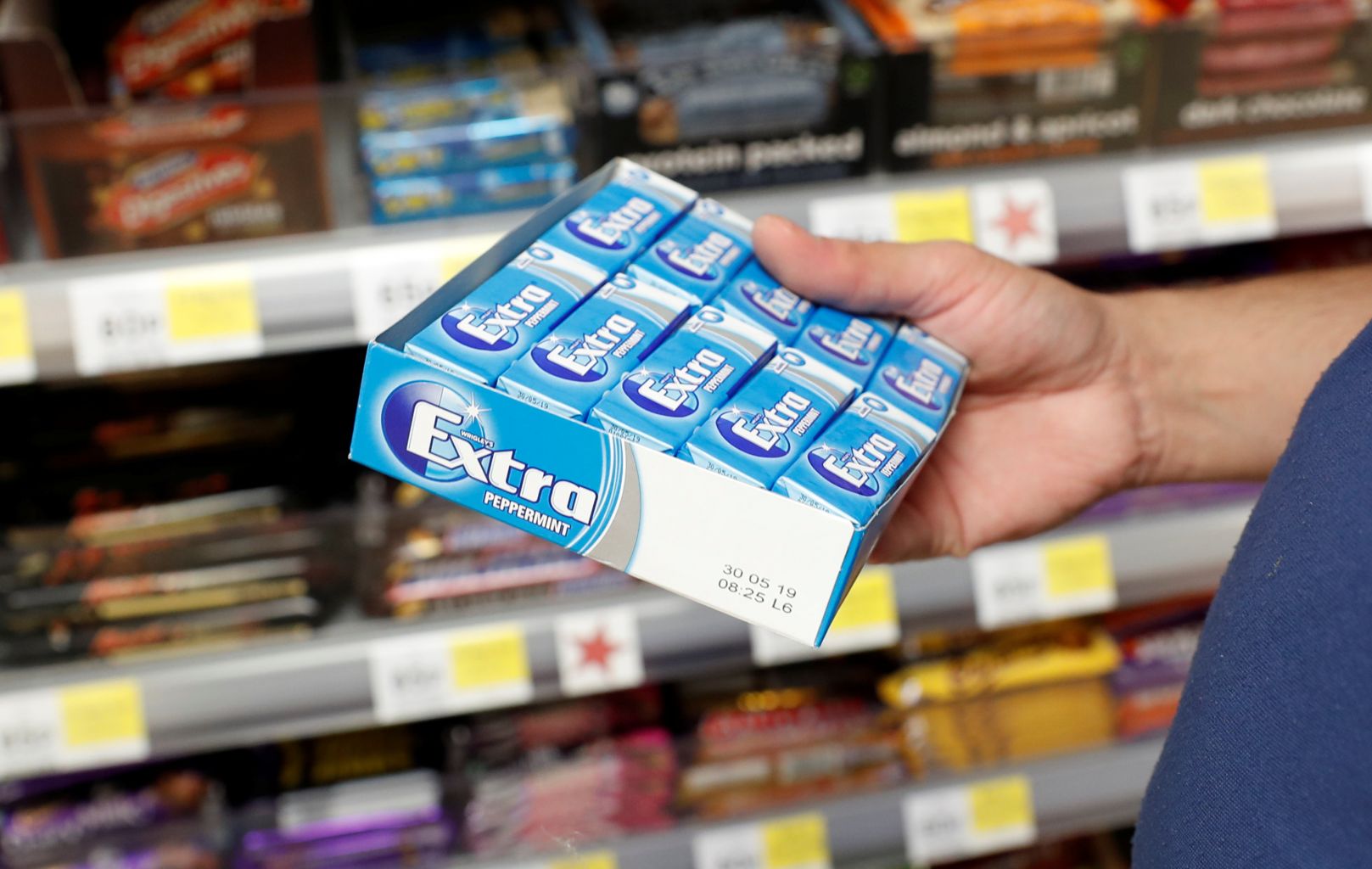 A shopworker re-stocks chewing gum at a supermarket in London, Britain.