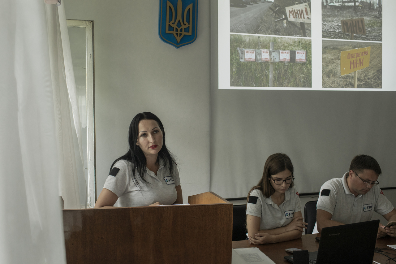 At the head of the class was a woman named Hanna, along with a board showing images of unexploded munitions and landmines. She explained to the class the risks of minefields and how they are marked.