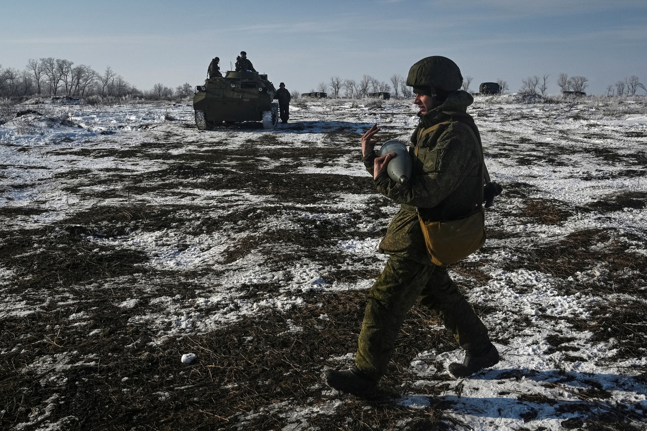A Russian army service member carries a howitzer shell during drills at the Kuzminsky range in the southern Rostov region, Russia, on Jan 26, 2022.