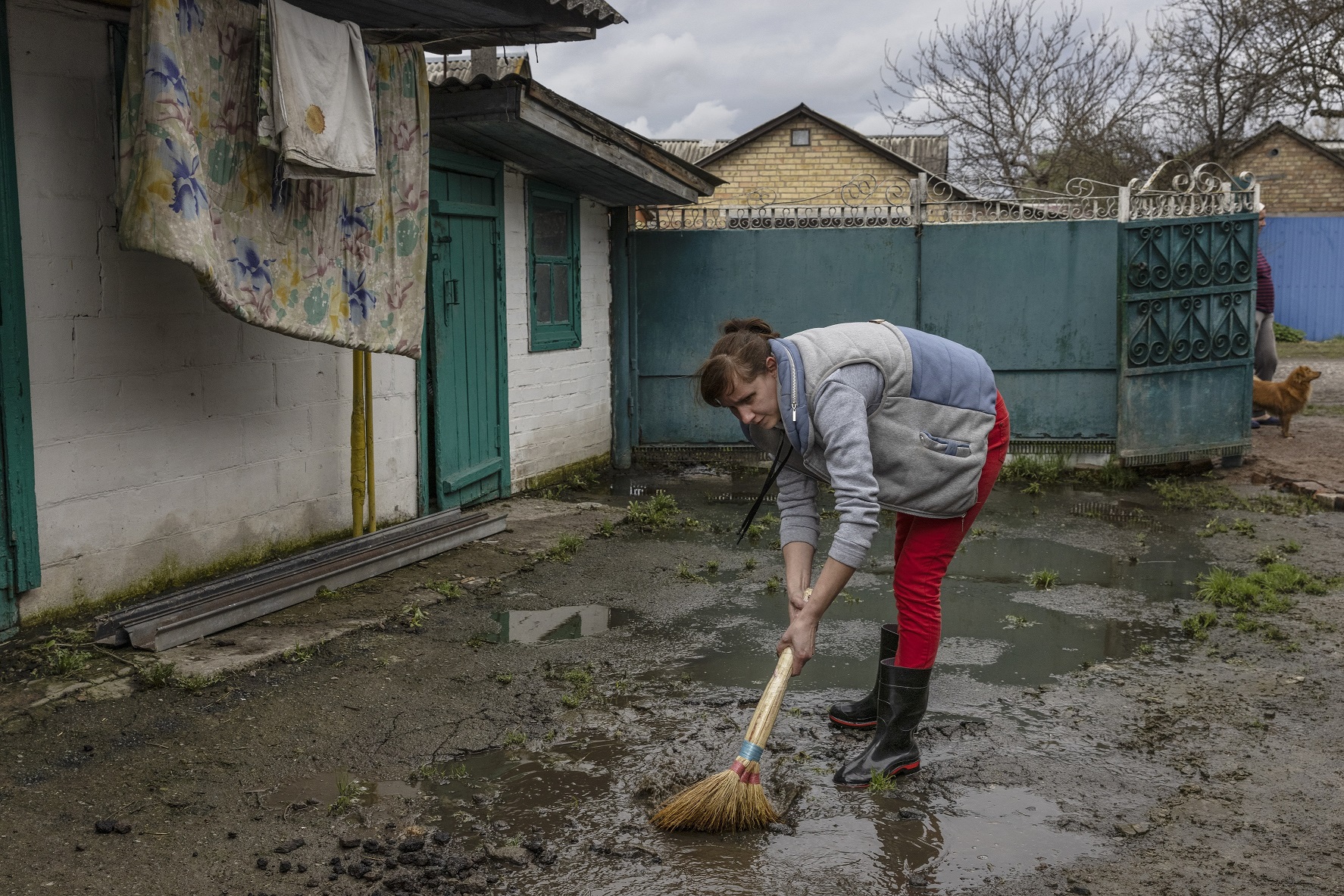 A woman sweeps mud and receding floodwaters from her yard in Demydiv, a village north of Kyiv, on April 26, 2022.
