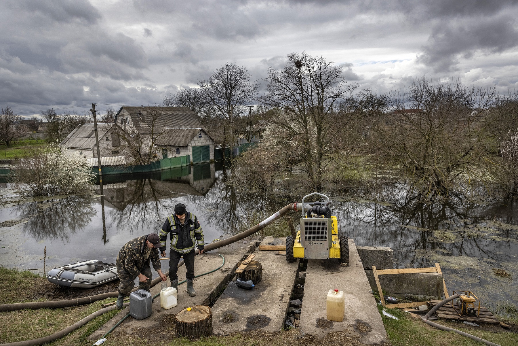 Residents refuel generators that power a pump drawing floodwaters from the village of Demydiv, on April 26, 2022.
