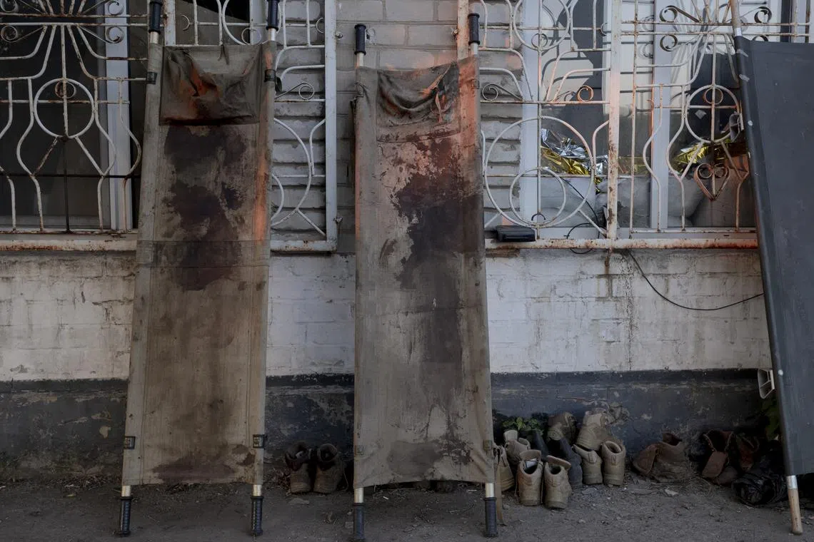 Stretchers and boots of wounded soldiers at the building in Donetsk where Mr Said Ismahilov works.