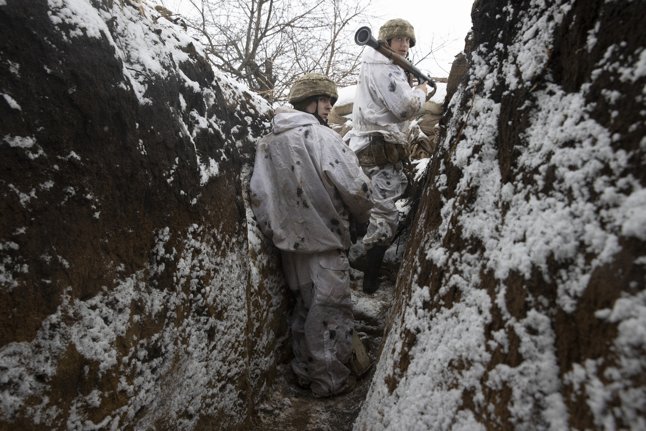 Ukrainian soldiers manning a frontline trench at Katerynivka, eastern Ukraine, on Jan 18, 2022.