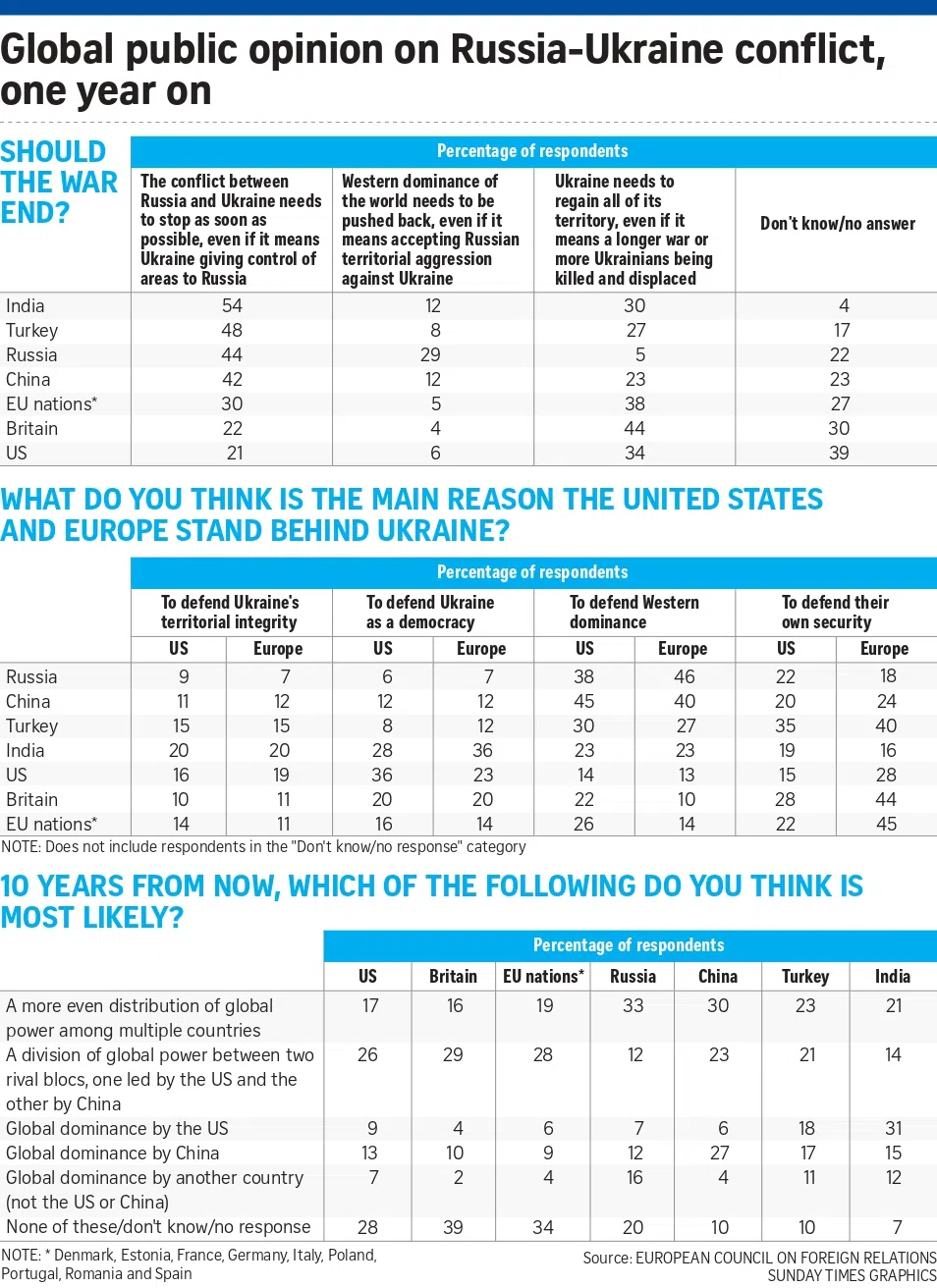 The reverse was true in the case of non-Western countries, with 54 per cent of Indian respondents, 48 per cent of Turks and 42 per cent of Chinese saying that it would be worth Ukraine giving up territory if it expedites the end of the war.
