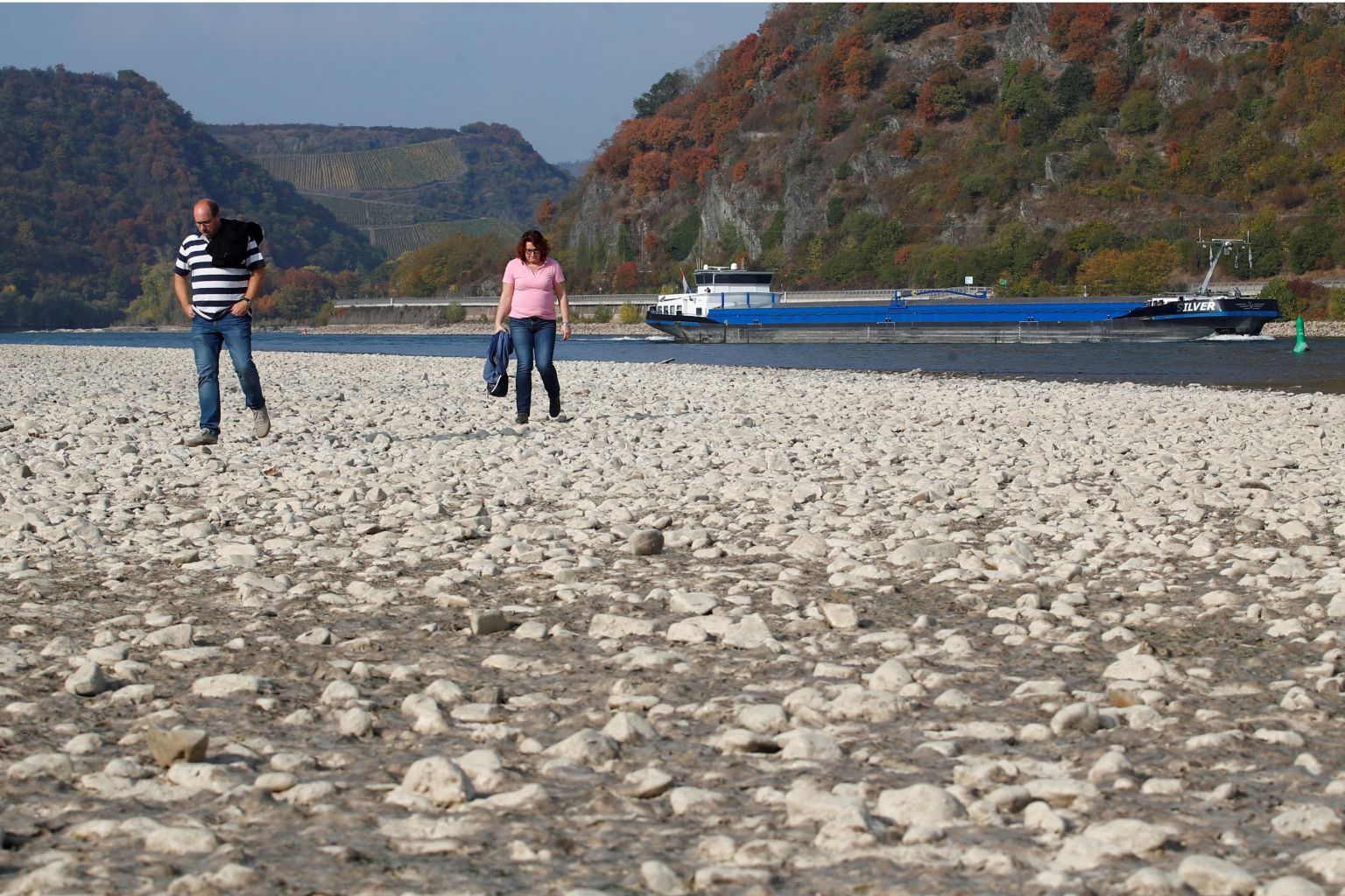 A couple walks through the dried out river bed of the Rhine, as water levels reached a historic low level and freight vessels cannot sail fully loaded on Europe's most important waterways, near Bacharach, Germany on Oct 19, 2018.