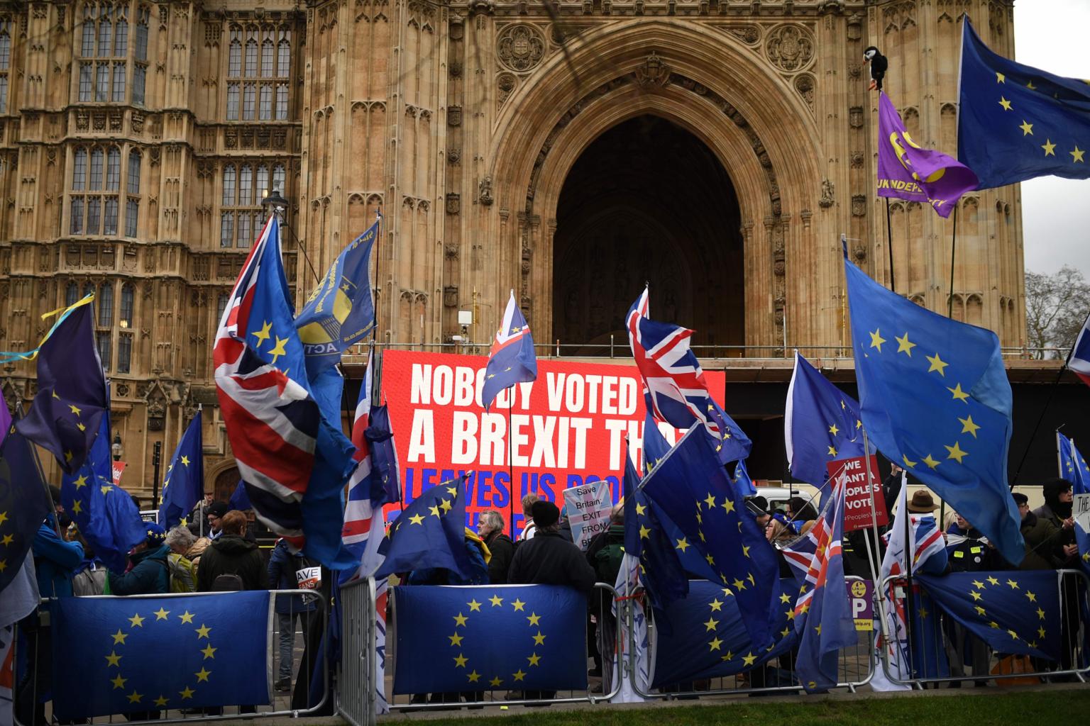 Protesters waving flags outside the Houses of Parliament in central London, on Jan 15, 2019.