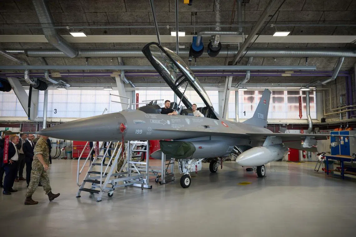 Ukrainian President Volodymyr Zelensky and Danish Prime Minister Mette Frederiksen sitting in an F-16 jet during Mr Zelensky's visit to Denmark in 2023.