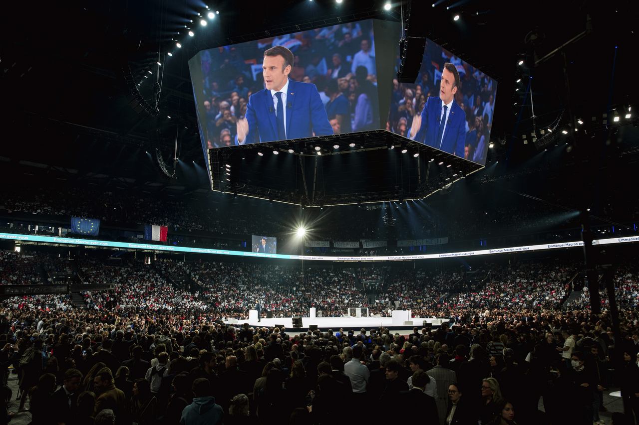 President Emmanuel Macron of France speaking at a reelection campaign rally in Paris on April 2, 2022.
