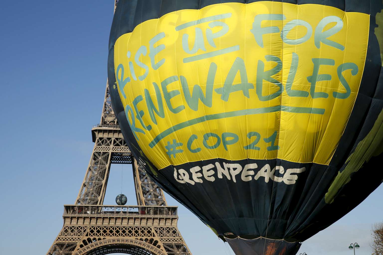 Greenpeace activists fly a hot air balloon next to the Eiffel tower ahead of the 2015 Paris Climate Conference.